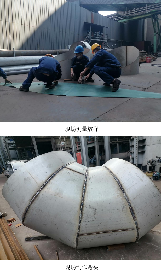 值得一提的是,這是西昌藍(lán)鼎首次獨(dú)立完成直徑1.32米彎頭制作全流程。面對(duì)不規(guī)則角度導(dǎo)致測(cè)量和放樣難度大的問(wèn)題,檢修班長(zhǎng)帶領(lǐng)班員在沒(méi)有專業(yè)放樣設(shè)備的情況下,憑借扎實(shí)的幾何計(jì)算功底和豐富現(xiàn)場(chǎng)經(jīng)驗(yàn),精準(zhǔn)完成多角度彎頭放樣;焊接人員采用分段對(duì)稱焊接工藝,有效控制不銹鋼焊接變形,確保煙道系統(tǒng)密封性和使用壽命達(dá)到設(shè)計(jì)要求。